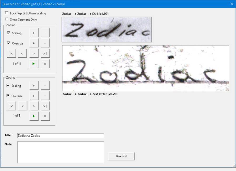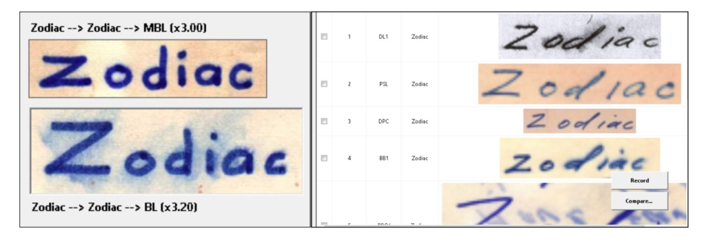 Words that have been transcribed can be intra-compared or compared with each other. All words “Zodiac” in the exhibit below were from the Zodiac letters.
