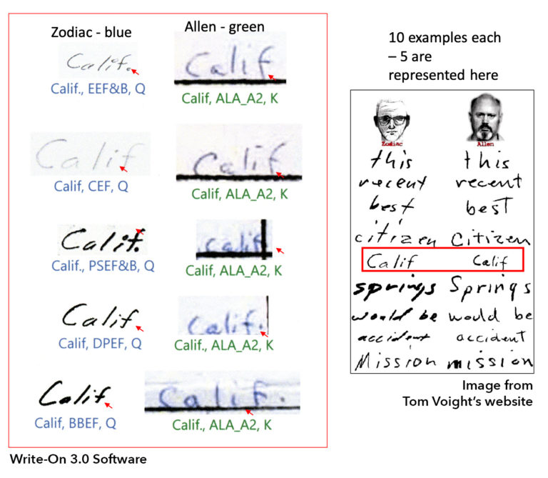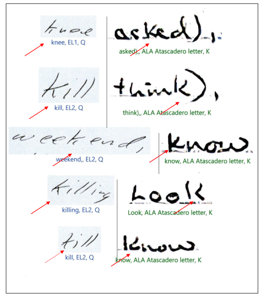However, a closer comparison of letters illustrates that there are differences seen in the letters “k.” The “k’s” on the left are from the Zodiac letters. The “k’s” on the right are from the main suspect’s writing, Arthur Lee Allen.