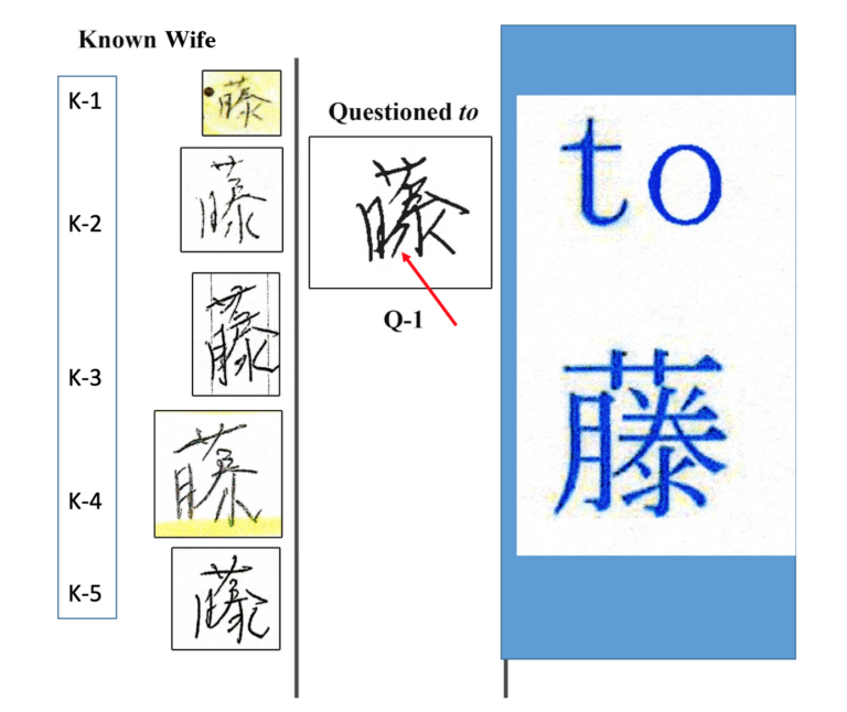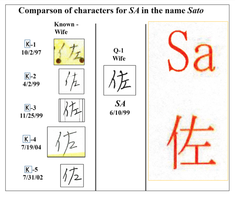 Just as other cases, family law cases are not restricted to writing in English. There are many characteristics in writings that are not dependent solely on the configurations of letters or characters. As examples, a few of the characteristics that are independent of the letter or character formation include spacing, arrangement of the writing on the page, pressure, size, slant, proportions, pagination, connecting strokes, fluency or dysfluency, writing skill, subtle writing habits, numbers and symbols. When working with a different language from that of the document examiners native language, it is important to follow the same procedures used in all handwriting comparisons, i.e. the same Kanji or Chinese character needs to be compared to the same Kanji or Chinese character. It may be necessary to retain a specialist in the language to translate and confirm that the examiner understands how the language is constructed. The examiner may also need to have a copybook example by which the person was taught to see how that person has individualized the model. In the following case, Ms. Fisher was successful in demonstrating to the court that the husband, not the wife, signed the wife’s name on the deed to the property. The following exhibits dissected the name Sato that contained two different Kanji characters and juxtaposed them to the questioned name Sato and the known names Sato written by the wife.