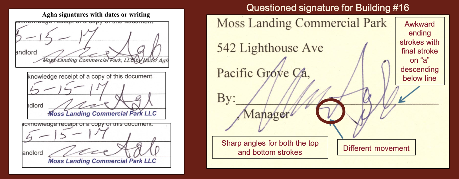 The simulator attempting to copy the handwriting habits of Mr. Agha (right image) was unsuccessful. This can be seen in the numerous mistakes including the five sharp angled strokes at the beginning of the name.